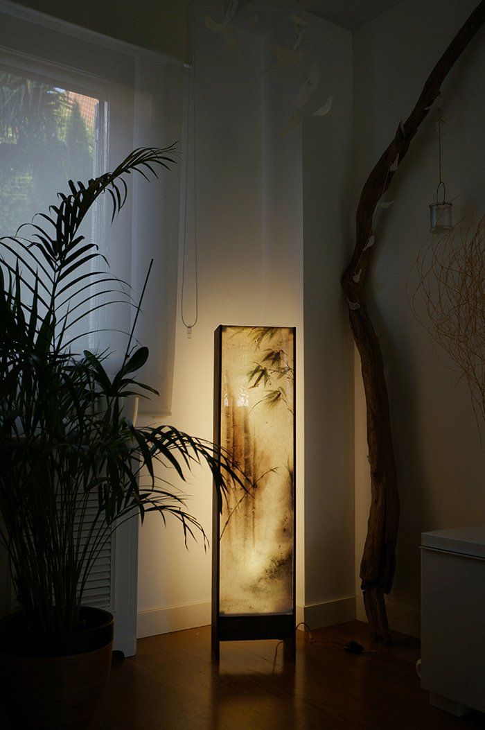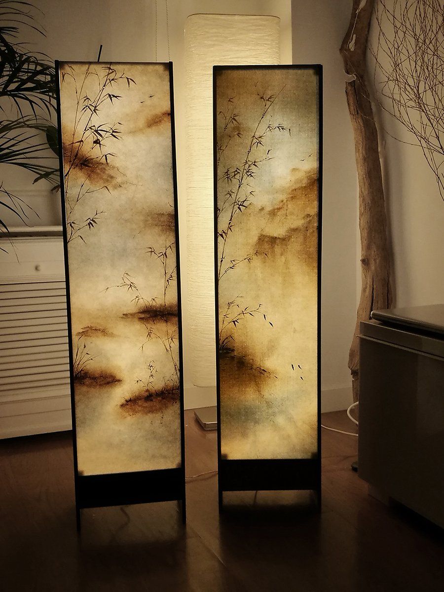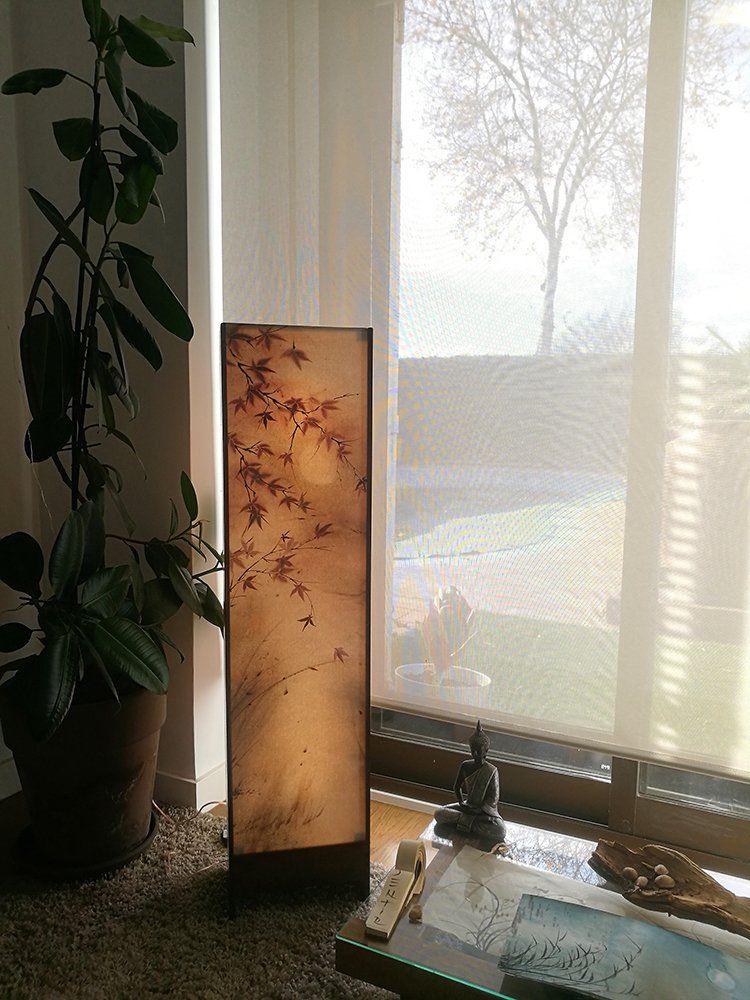 Lámparas artesanales fabricadas en madera teñida y barnizada, con laminas de doble metacrilato (opal y transparante ) en cara frontal y posterior, que incluye pintura original inspirada en la pintura oriental (china ,japonesa y coreana), especialmente en los trazos y filosofía sumi-e. Pintura en tinta china y acuarela sobre papeles de fibra natural japonés (kozo), y coreanos (hwasunji yensun) con la aplicación de tratamiento urauchi, técnica oriental para darle mayor soporte al papel, eliminar arrugas, resaltar tonos.