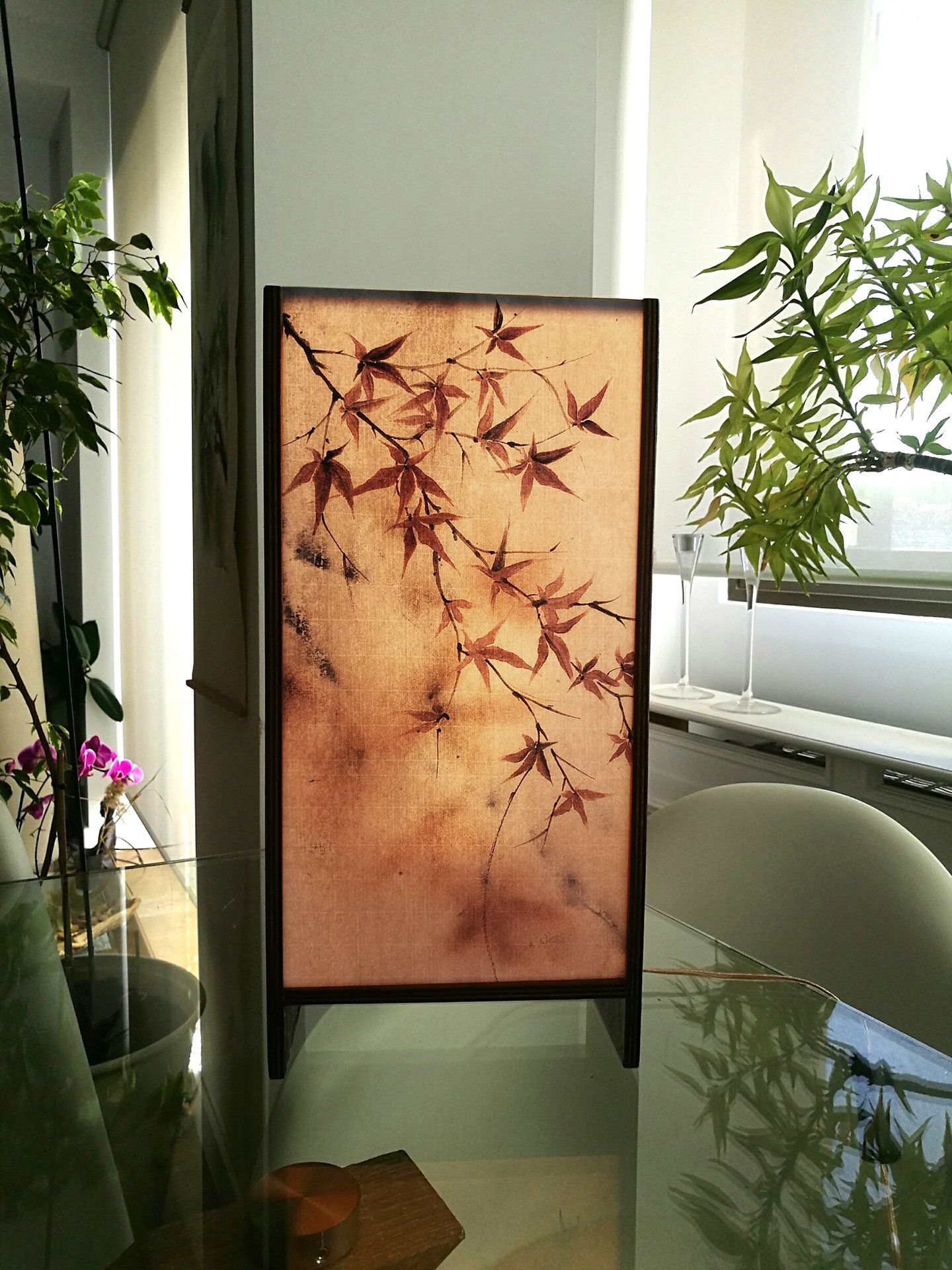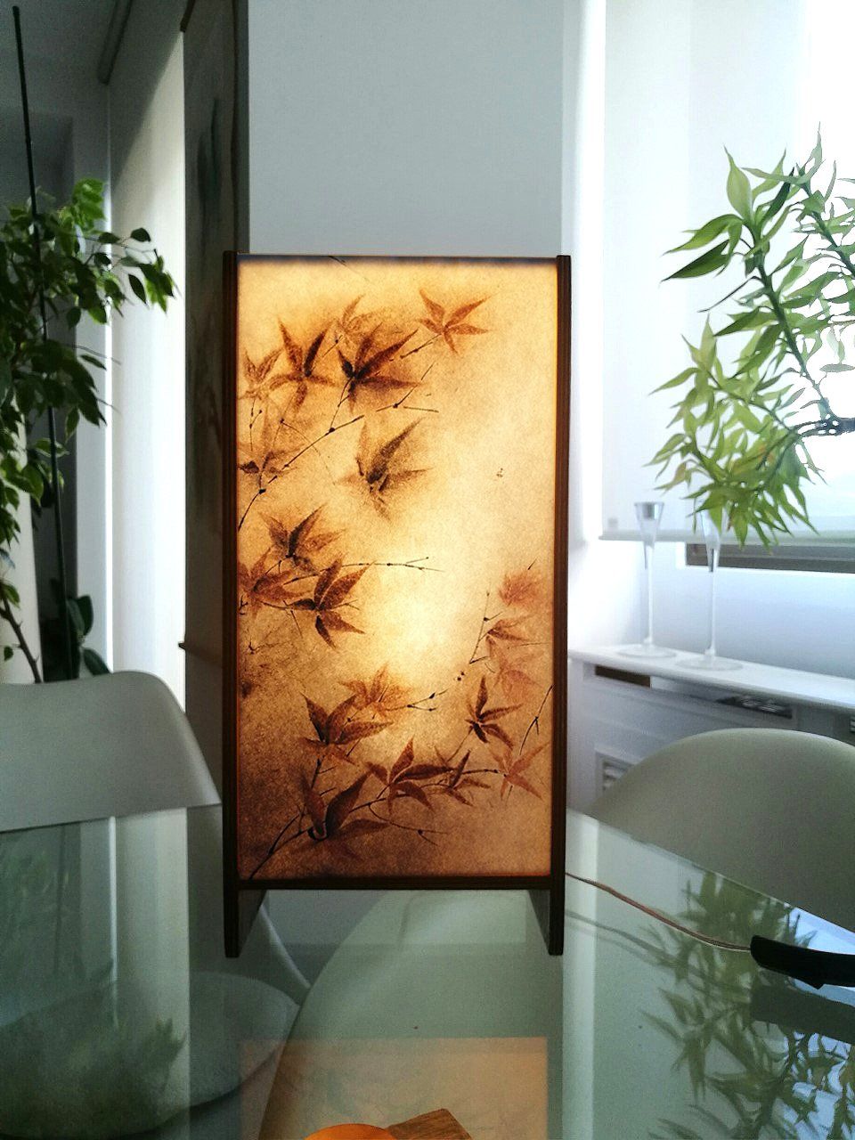 Lámparas artesanales fabricadas en madera teñida , con láminas de doble metacrilato (opal y transparante ) en cara frontal, que incluye pintura original inspirada en la pintura oriental (china ,japonesa y coreana), especialmente en los trazos y filosofía sumi-e. Pintura en tinta china y acuarela sobre papeles de fibra natural japonés (kozo), y coreanos (hwasunji yensun) con la aplicación de tratamiento urauchi, técnica oriental para darle mayor soporte al papel, eliminar arrugas, resaltar tonos.
